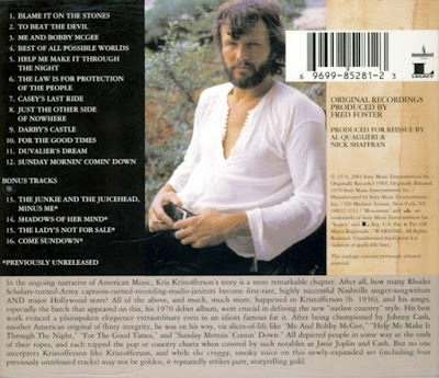 Sirva éste su álbum debut , de homenaje póstumo y agradecido al recientemente fallecido Kris Kristofferson ……. fue reeditado por Monument , con la misma colección de 12 canciones y en el mismo orden , en 1971 , con otra portada y otro título , “ Me And Bobby McGee “ , la gran joya de Kris ……. Nosotr@s os ofrecemos aquí en el BLOG el disco publicado en 1970 reeditado en 2001 con cuatro “ bonus tracks “ ……. y va dedicado a Minik y a su Padre , porque , en palabras de Kris , “ I’d trade all my tomorrows for one single yesterday “ ( “ Cambiaría todos mis mañanas por un solo ayer “ ) .